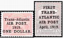 филат. назв. марки, подготовленной для трансатлантического полета из Ньюфаундленда в Европу известных в то время авиаторов Д. Алкока и А. Брауна — надпечатка (англ.) «Трансатлантическая авиапочта. 1919. Один доллар» на марке 1893 Ньюфаундленда. Полет начался 14.07.1919. Через 17 ч самолет приземлился в Ирландии. Было перевезено 196 писем.