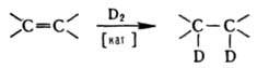 или тозильной группы под действием доноров дейтерид-иона, напр.: RX + LiAlD4 : RD + LiAlD3X; в) радикальном замещении атома галогена под действием триалкилдейтеростаннанов: RX + (С4Н9)3 SnD : RD + (C4H9)3SnX; г) присоединении дейтеросодержащих агентов к кратным связям С=С, С=С, С=О и др. Наиб. известно присоединение D по связи С=С [кат. - Pd на угле или комплексы металлов типа трис-(трифенилфосфин)родийхлорида]: