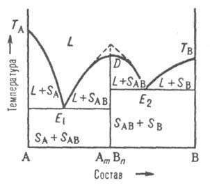 В точке плавления, соответствующей стехиометрич. составу АmВn, на линии ликвидуса имеется сингулярный максимум (рис. 5); это значит, что линия D - АmВn разделяет систему на две подсистемы. На диаграмме максимуму отвечает излом (показан пунктиром на рис. 5). В каждой из подсистем взаимод. между компонентами, соотв. А и АmВn, В и АmВn, может быть представлено диаграммами эвтектич. или перитектич. (или любого другого) типа. Если соед. AmBn частично диссоциировано в жидкой фазе, максимум на кривой ликвидуса несколько сглажен в соответствии со степенью диссоциации. Если соед. АmВn диссоциирует и в твердом состоянии, то сглаженный максимум будет и на линии солидуса. Однако независимо от вида максимума, общий характер фазового равновесия в системе определяется характером взаимод. соед. АmВn с компонентами А и В.