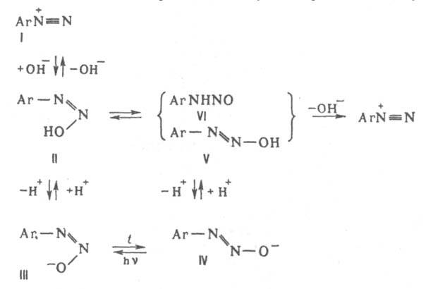 -диазогидроксида (V), в темновых условиях в катион I не переходят, а поэтому и не способны к азосочетанию.