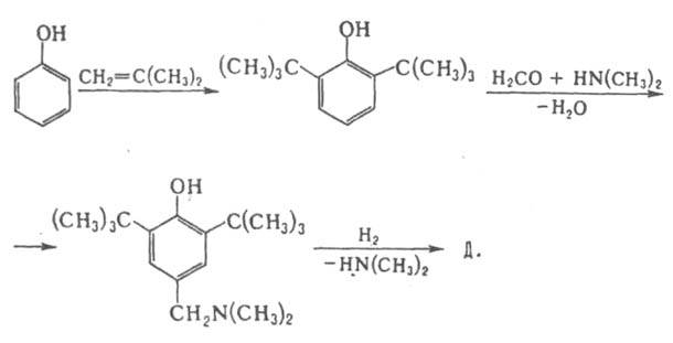 -бутилфенола за один проход 70% от теории. Аминометилирование проводят при 80-100°С в р-ре метанола; сырой продукт подвергают гидрогенолизу (кат. - сплав Ni + Al; Ni + Сr или Ni + Сu) при 140-160°С, после чего перекристаллизовывают из метанола или этанола. Выход Д. практически количественный.