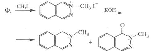 образуется 2-метилфтала-зинийиодид, превращающийся при обработке щелочью в смесь