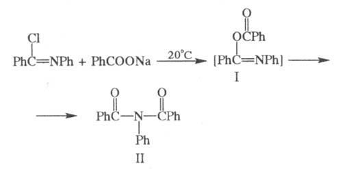 В соответствии с этим механизмом О-ацилиминоэфиры (ф-ла I) изомеризуются настолько легко, что в большинстве случаев вьщелить их не удается - в р-ции сразу образуются продукты перегруппировки (имиды II):