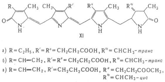 Билирубин и биливердин м. б. синтезированы конденсацией бромметилпирролинона VII с пирролом VIII с послед. окислением образовавшегося продукта или конденсацией пирролинона IX с пирролальдегидом X.