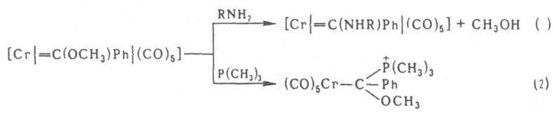 Вместо литийорг. могут быть использованы магнийорг соединения, а также диалкиламиды и фосфиды щелочных металлов. Р-ции нуклеофилов с изонитрильными и карбиновыми комплексами также приводят к К., напр.: