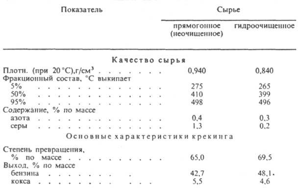 Примеси в сырье металлов, коксообразующих в-в, а также азотистых и сернистых соед. оказывают отрицат. влияние на К. к. Так, при повыш. содержании Ni увеличивается коксообразование - разрушается цеолит катализатора, Na - заплавляются его поры. Возрастанию отложений кокса способствует также повышение коксуемости сырья. Увеличение содержания азота приводит к дезактивации и снижению селективности катализатора, возрастание содержания соед. серы - к повышению ее концентрации в продуктах крекинга. Поэтому стремятся ограничить, напр., коксуемость исходных нефтяных фракций значением, не превышающим 0,3% по массе, а содержание в сырье Ni + V и Na - 1мас. ч. на млн. Один из самых рациональных способов подготовки нефтяных фракций для К.к.-гидроочистка , позволяющая значительно повысить степень превращ. сырья и выход бензина, а также снизить коксообразование и содержание серы в продуктах крекинга. В табл. 2 приведены данные по гидроочистке и К. к. в лифт-реакторе тяжелых фракций западносибирской нефти. Табл. 2. ВЛИЯНИЕ ГИДРООЧИСТКИ НА КАЧЕСТВО И РЕЗУЛЬТАТЫ КРЕКИНГА ВАКУУМНОГО ГАЗОЙЛЯ