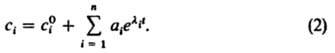 где аn, bn - коэффициенты разложения ф-ции c(t) в рад (амплитуды отдельных гармонич. компонент), An - комплексные амплитуды, w - частота колебаний (i - мнимая единица). В общем случае амплитуды и частоты колебаний могут изменяться во времени (колебания затухающие, нарастающие, модулированные). Колебания концентраций промежут. соед. могут быть непериодическими или иметь непрерывный спектр. Колебания концентраций промежут. соед. - относительно редкое явление, наблюдаемое в ходе нек-рых сложных р-ций. Элементарные хим. р-ции являются релаксац. процессами, обеспечивающими монотонное приближение реагирующей системы к состоянию термодинамич. равновесия. Для возникновения колебаний в ходе гомог. изотермич. р-ции необходимо наличие промежут. соед. и взаимодействие между ними. В открытых системах существуют стационарные состояния, в к-рых концентрация c(i) i-го промежут. соед. не зависит от времени (сi=c0i). При небольших отклонениях системы от стационарного состояния изменение сi описывается суммой экспонент с комплексными показателями:
