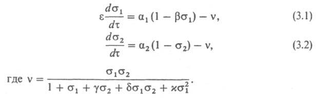 Субстраты S1 и S2 могут поступать в систему извне (напр., за счет притока в проточном реакторе или путем диффузии через мембрану) или образовываться в результате медленных гомог. р-ций S0iDSi (i=1,2); так же происходит удаление продукта Р, не влияющего на ход р-ции. S1E, S1S2E и S1S1Е - фермент-субстратные комплексы; ингибирование фермента происходит из-за образования неактивного комплекса S1S1E. В этой системе имеется 6 динамич. переменных: концентрации субстратов [S1] и [S2], фермента [Е] и разл. форм фермент-субстратных комплексов, причем [Е] + [S2E]+[S1S2E]+[S1S1E]=е - полная концентрация фермента. Обычно e<<[S1] и e<<[S2], поэтому можно применить квазистационарности приближение и представить концентрации фермент-субстратных комплексов как алгебраич. ф-ции концентраций субстратов. В результате поведение системы можно описать двумя дифференц. ур-ниями относительно [S1] и [S2]. Удобно использовать безразмерные переменные s1=[Sl]/K1 и s2=[S2]/K2 (K1 и К2 - константы Михаэлиса), параметры a1 и a2 - скорости поступления субстратов, а также безразмерные комбинации констант скорости элементарных стадий e, b, g, d, ( и безразмерное время t. Тогда дифференц. ур-ния принимают вид: