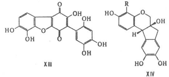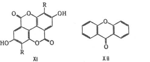 (Quebracho Colorado), и ее диметиловый эфир (XI; R=ОСН3), встречающийся в корнях рода молочая (Euphorbia formosana), и др.; производные ксантона (XII) - красители желтого цвета, напр. гентизин (1,7-дигидрокси-З-метокси-ксантон), раневелин (1,4,8-тригидрокси-З-метилксантон).