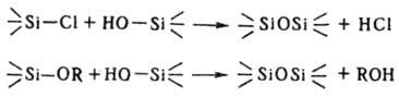 Эти р-ции происходят также при гидролитич. поликонденсации органохлор- и органоалкоксисиланов и могут значительно влиять на строение конечных олиго- и полисилоксанов. Вторая р-ция протекает при вулканизации кремнийорг.