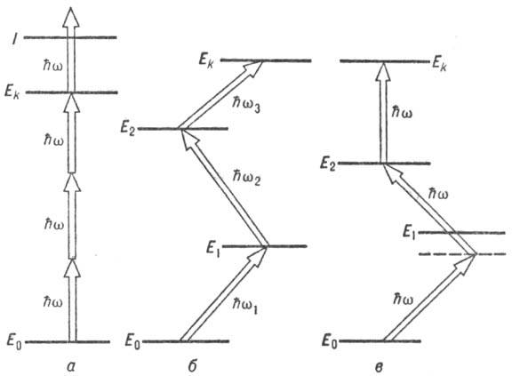 типу возбуждения. Атом (молекула) может резонансно поглотить одновременно п фотонов, если их суммарная энергия равна разности энергий начального (E0)