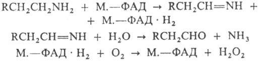 алифатич. жирно-ароматич. и гетероцик-лич. моноаминов по схеме: М.-моноаминооксидаза, ФАД