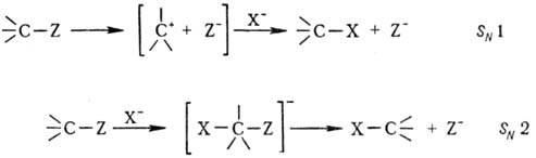напр. нуклеоф. замещение у насыщ. атома углерода или в ароматич. кольце, нуклеоф.