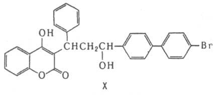 В связи с появлением крыс, устойчивых к ряду антикоагулянтов, найдены новые эффективные соед. - куматетралил (в ф-ле IX R = Н), дифенакум (в ф-ле IX R = 4-С6Н5С6Н4; ЛД50 1,8 мг/кг), бродифакум (в ф-ле IX R = 4-(4-ВrС6Н4)С6Н4; ЛД50 0,27-0,65 мг/кг), действующий даже после однократного приема, а также бромадиолон (X).