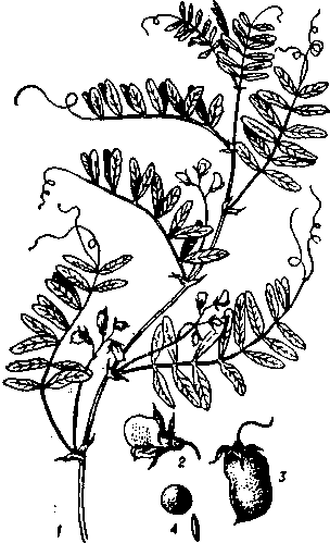 Чечевица пищевая: 1 — растение; 2 — цветок; 3 — плод (боб); 4 — семя.