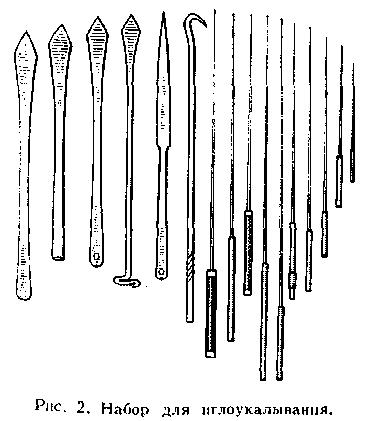 У животных таких каналов 14 (рис. 1).Для И. пользуются спец. иглами (рис. 2). Существует 3 способа введения иглы: при 1-м иглу вводят медленно, вращая её; при 2-м делают быстрый одномоментный Укол; при 3-м тонкую иглу резким движением вводят на глубину 1 см, затем медленным вращением продвигают её вглубь. |