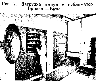 Препараты, высушенные методом Л., обладают хорошей растворимостью и при добавлении к ним воды или физиол. р-ра легко переводятся в исходное нативное состояние. Процесс Л. состоит из предварительного замораживания препарата, первичного высушивания, досушивания, укупорки ампул (флаконов) с высушенным препаратом. Для сохранения исходных свойств препаратов или высокой жизнеспособности микроорганизмов в процессе Л. и последующем хранении используют различные защитные среды (стабилизаторы): сыворотку крови животных, альбумин, обезжиренное молоко, желатину, желатозу, пептон, сахарозу, сорбит, поливинилпирролидон, глутамат натрия и их комбинации. Предварительное замораживание материала проводят в морозильных камерах при t от —40 до —60°C или при помещении материала в смесь спирта с сухой углекислотой (t—78°C), чем избегают вспенивания препарата в процессе Л. Замороженный материал в ампулах или флаконах быстро переносят в сушильную камеру (сублиматор), в к-рой создаётся глубокий вакуум и поддерживается пониженная темп-ра (до —40°С). На биофабриках, биокомбинатах и в институтах применяют камерные вакуумные аппараты различных марок (рис. 1, 2). Существуют аппараты, в к-рых предварительное замораживание препаратов осуществляется непосредственно в сублимационной камере. В результате сублимации свободная вода удаляется с поверхности замороженного материала, препарат переходит из твёрдого (замороженного) состояния в сухое (пористая масса, почти не изменённая в объёме ). Досушивание объекта проводят в этой же камере при t до 20°C и выше. При этом из препарата удаляется связанная вода. После окончания Л. вакуумный насос выключают и в камеру через фильтр подают стерильный сухой воздух или азот. |