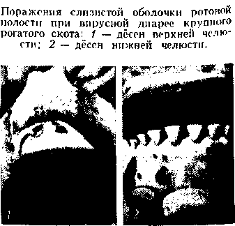 ВИРУСНАЯ ДИАРЕЯ КРУПНОГО РОГАТОГО СКОТА (Diarhea viralis bovum) , болезнь слизистых, инфекционный энтерит крупного рогатого скота, вирусная контагиозная болезнь, характеризующаяся воспалением и изъязвлениями слизистых оболочек пищеварительного тракта и проявляющаяся ринитом, лихорадкой, диареей и иногда хромотой. Заболевание распространено во мн. странах мира; регистрируется и в СССР, Этиология. Возбудитель болезни — сферич. РНК-содержащий вирус рода Pestivirus сем. Togaviridae. Величина вирусных частиц 30—40 нм. Вирус может годами сохраняться при t ниже 20°С, в культуральной жидкости не теряет биол. активность до 1 года, в крови, лимфатич. узлах, селезёнке и др. патол. материале — до 6 мес. При t 25 °С в течение 1 сут вирус практически не снижает биол. активности, при t 37 °С погибает через 5 сут. Вирус чувствителен к эфиру, хлороформу, трипсину и дезоксихолату натрия. Эпизоотология. В естеств. условиях В. д. к. р. с. болеют кр. рог. скот, буйволы, олени и косули. Наиболее восприимчивы животные в возрасте от 6 мес до 2 лет. Источник возбудителя инфекции — больные животные. В зависимости от стадии болезни возбудитель выделяется из организма с калом, мочой, слюной, носовыми и глазными секретами, а также экссудатом из воспалительных очагов. Вирусоносительство может быть и течение 4 мес после переболевания. Пути и способы передачи возбудителя инфекции изучены недостаточно. Факторами передачи возбудителя инфекции могут быть заражённая обувь и одежда обслуживающего персонала, а также инфицированные корм, вода и предметы ухода за животными. Способствуют распространению вируса скопление или перегруппировка животных. Болезнь наблюдается в течение всего года, но число вспышек увеличивается в холодное время года. Существенную роль в течении и исходе заболевания играют условия содержания животных, биол. характеристика штамма, степень инфицирования стада и другие факторы. Летальность может варьировать в очень широких пределах (4—100% ). Иммунитет не изучен. Течение и симптомы. Инкубационный период 6—9, иногда 2—14 сут. Болезнь протекает латентно, подостро, остро и хронически. При латентной форме болезнь устанавливают обнаружением в сыворотке крови специфич. антител. Подострое течение характеризуется внезапным началом, кратковременным (до 24 ч) незначительным (39,7—40,0 °С) подъёмом темп-ры тела, учащённым сердцебиением и дыханием, частичной потерей или полным отсутствием аппетита. Могут возникнуть незначительные быстропроходящие поражения слизистой оболочки ротовой полости в виде гиперемии, эрозий и изъязвлений; у нек-рых животных — носовые истечения, слезотечение, кашель, кратковременная диарея. Острое течение начинается внезапным подъёмом темп-ры (40,5—42,4 °С), умеренной или сильной депрессией, тахикардией, учащением дыхания и потерей аппетита. С подъёмом темп-ры появляется резкая лейкопения (2000—3000 клеток в 1 мм3), часто сопровождающаяся лимфоцитозом. Через 1—2 сут начинается повторный резкий подъём темп-ры. В это время у больных животных отмечаются гиперемия слизистой оболочки носа и носовое истечение, к-рое в дальнейшем становится слизистым или слизисто-гнойным. В тяжёлых случаях лицевая часть головы покрывается липкими выделениями, засыхающими в виде корочек, под к-рыми образуются эрозии. Катаральный конъюнктивит и сильное слезотечение иногда сопровождаются на