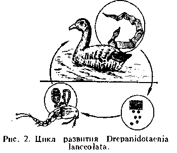 ДРЕПАНИДОТЕНИОЗЫ (Drepanidotaenioses) , гельминтозы водоплавающих и болотных птиц, вызываемые цестодами Drepanidotaenia lanceolata и D. przewalskii, сем. Hymenolepididae. Распространены повсеместно. Наибольший ущерб наносит Д. гусят. D. lanceolata дл. до 230 мм. Сколекс (рис. 1) снабжён 4 присосками и хоботком с 8 крючками. Яйца овальной формы, размером 0,046— —0,106 X 0,037—0,103 мм. Внутри яйца онкосфера с 3 парами эмбриональных крючков. D. przewalskii дл. до 200 мм, Сколекс грушевидный. Хоботок с 10 крючками. Яйца 0,024—0,029 X 0,017— 0,020 мм, такие же, как у D. lanceolata. Развитие дрепанидотений происходит с участием промежуточных хозяев—циклопов и водных моллюсков (рис. 2). В теле циклопа онкосфера выходит из яйца и развивается в цистицеркоид, к-рый в организме дефинитивного хозяина прикрепляется к слизистой оболочке тонких кишок и достигает половой зрелости на 15—19-е сут. Путь заражения птиц алиментарный (при заглатывании с водой инвазированных промежуточных хозяев). |